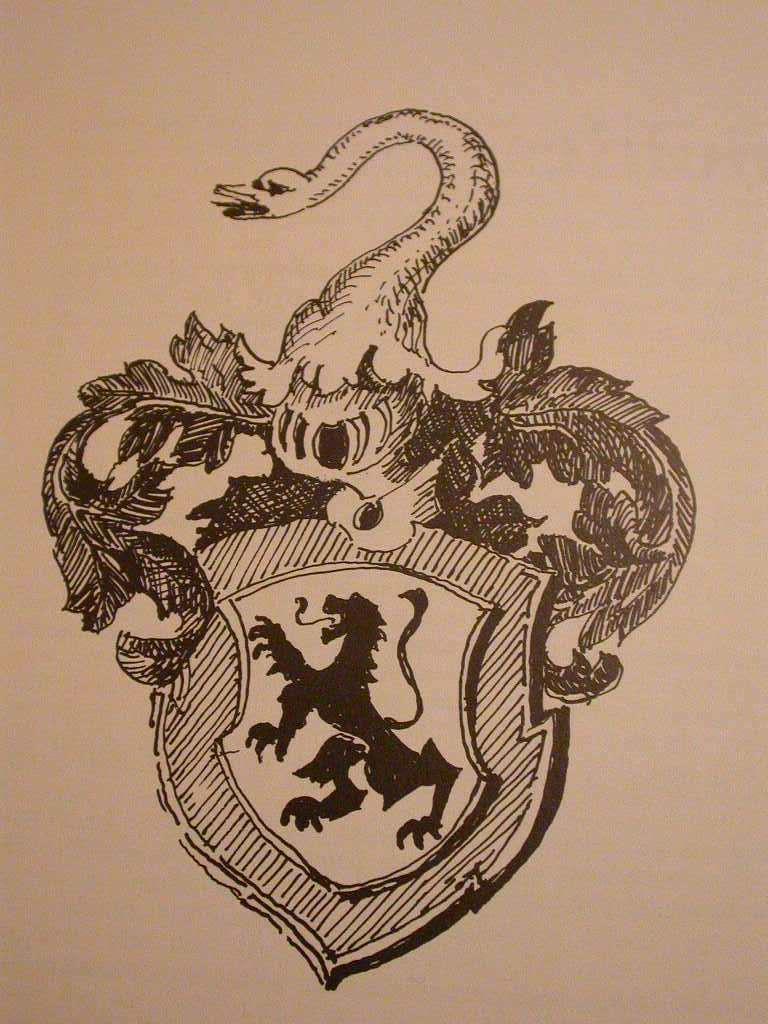 Ecu d'argent à la bordure de gueules, au lion noir rampant, timbré d'un casque de trois-quarts assorti de ses lambrequins, surmonté d'un cimier à col de cygne.